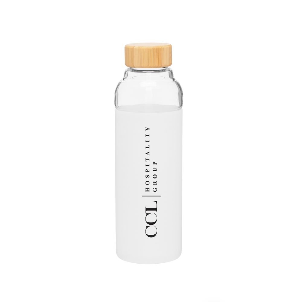 Travel in style with this H2go Bali Bottle! Made of single wall borosilicate glass, each bottle measures 9"H x 2 7/8"W and features an 18 oz. capacity, threaded bamboo lid and protective silicone sleeve. Hand washing recommended. Do not microwave.