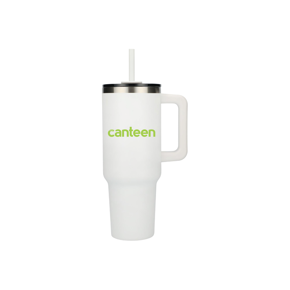 Meet the Pinnacle, a budget-friendly 40 oz travel tumbler that doesn’t compromise on style or performance – all while being made from recycled materials. Constructed using 91% post-consumer recycled 18/8 stainless steel – the 40 oz Pinnacle Travel Tumbler features high-performance copper vacuum insulation that will keep drinks cold 24+ hours for all-day hydration, and a durable powder coating with a sleek matte finish that matches the handle, straw and lid slider for a premium, retail look and feel. The 100% recycled plastic, press-on swivel lid securely holds the Tritan straw in place, is easily rotated to expose the drink opening, and features a proprietary lid slider to prevent spills. A sturdy ergonomic handle makes carrying this tumbler effortless, and the slim base fits in most car cup holders. Hand Wash Only. 40oz