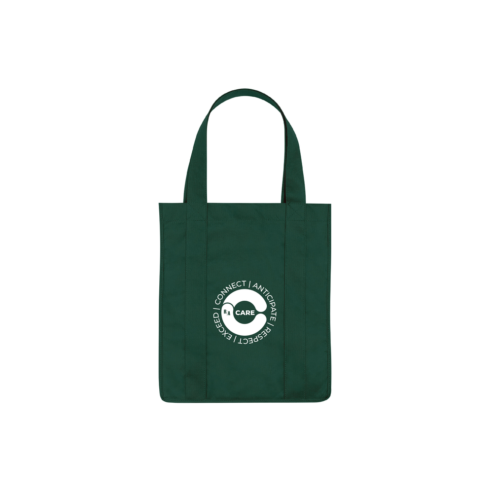 This resuable non woven tote is made of 80 gram non-woven coated water-resistant polypropylene. It is a great choice to take to the grocery store, market, or book store! Has a 10" gusset with bottom insert and 20" handles. Spot Clean/Air Dry.