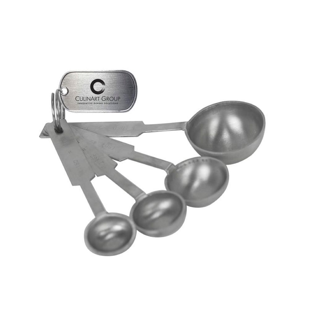 Attached together with a metal ring with tag that can be customized with your name and logo, the spoon set includes 1/4 tsp, 1/2 tsp, 1 tsp and 1 tbs.